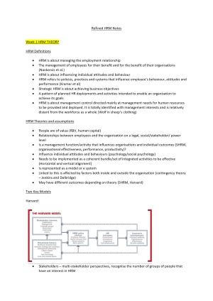 These notes are an extremely comprehensive, yet concise compilation of content from weeks 1-12. It provides all content relevant for the final exam, in its most concise, easy to read and process form. This was extremely useful for exam preparation as the first step to success in the subject is to master and understand the content sufficiently. These notes make an excellent starting point for final exam revision, and can also be used as a tool throughout the semester to better understand the content. Topic List: HRM Models and Theories (Part 1 and 2) HRM Perspectives and Critiques Managing Diversity and Employee Wellbeing HR in Context - The Law Work Design and Challenges in a Global Environment HR Planning in a Diverse Environment Attracting and Selecting Talent Managing Performance Retaining and Developing Talent Strategic Reward Management