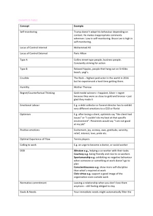 This table provides a concise and comprehensive overview of some real life examples used to explain OB terms/concepts. This is extremely useful as it will enhance your knowledge of the content, create better retrieval cues and also help predict the way in which exam questions may be asked. Given that the exam is largely scenario based, and calls for application of the content covered in Weeks 1-12, it is important to have examples ready. Topic List: Self and Authenticity Emotional Intelligence Positive Psychology and Happiness Judgement and Decision Making Will Power and Work Motivation Networking, Power and Politics Group and Team Dynamics Leadership Ethics Negotiation