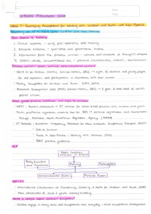 Note: These are handwritten notes. Topics: Becoming an OT to work with children and their families Collaborative goal setting with children Information gathering intervention with children and youth The Four Quadrant Model of Facilitated Learning - 4QM Application of 4QM Occupational Therapy for children with developmental coordination disorder (DCD) Cognitive orientation to (daily) occupational performance (CO-OP) + application of CO-OP Occupational therapy for children and youth with autism spectrum disorder Working with children and adolescents with sensory processing challenges Application of sensory processing frame of reference Occupational therapy for children with developmental delay Collaborating with families to enable participation: occupational performance coaching Collaborating with families and application of coaching OT for children and youth with attention deficit hyperactivity disorder Engaging and motivating children OT for children and youth with learning disorder Identifying techniques in action (motivation and engagement)