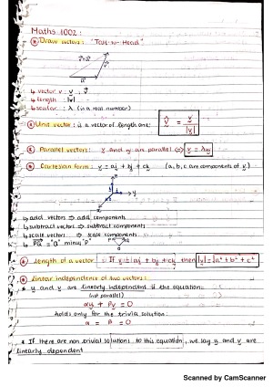 Note: These are handwritten notes. This is a revision summarised from 21 lectures Topics Covered: ** VECTORS: - Draw vectors - Unit vectors - Parallel vectors - Cartesian form - Length of a vector - Linear independence of two vectors ** DOT PRODUCTS: - Algebraic definition - Geometric definition - Cauchy Schwarz Inequality - Dot product rules ** CROSS PRODUCTS: - Algebraic definition - Geometric definition - Cross product rules ** LINES L: - Parametric vector equation of L - Parametric scalar equations of L - Cartesian equation - From point to lines ** PLANES P: - Vector equation of a plane P - Cartesian equation of a plane P - From point to plane ** INTERSECTIONS: - Point of intersection of a line and a plane - Intersections of planes ** SYSTEMS OF LINEAR EQUATIONS: - Row Echelon Form examples - Reduced Row Echelon Form examples ** MATRICES: - Addition, subtraction, scalar multiplication - Powers of matrix - Matrices and systems of operations - Matrix inverses - Manipulating matrix equations - Determinants - Eigenvalues and Eigenvectors - Eigenspace - Diagonalisation