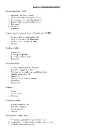 Full comprehensive notes that covers the entire course used to achieve a HD mark. Includes brief case descriptions that can be used when analogising between fact scenarios in exams. Notes are set out in a logical order that will be a great time saver in exams. I collated and distilled all lectures, readings and notes made in private tutoring into clear, easy to follow structures, ideal for following when answering exam questions. Easy to follow, easy to read and easy to utilise in exams. They contain all that any student needs in an Equity exam, plus extra subtle points for getting an edge over other students.