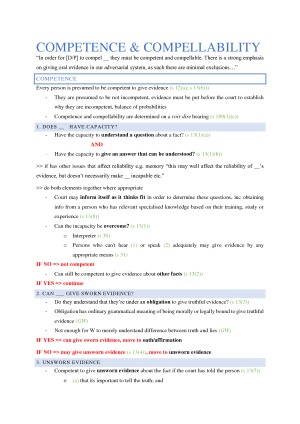 These are the notes I used for Evidence. They include - 'map' like structure of how to go through each type of problem question/issue for each topic in the course (including intro/conclusion sentences) - detailed summaries of all cases studied - notes on relevant policy discussion points/issues - tips from lecturers/tutors that were mentioned in class The preview I've uploaded is how to do a competence/compellability problem Topics covered: - Intro / relevance - Competence and compellability - Privilege - Examination of witnesses - Character and credibility - Right to silence - Tendency and Coincidence - Hearsay - Admissions - Illegally obtained evidence - Opinion