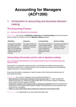 Notes are based on weekly readings, modules and workshops and cover the following topics: 1. Introduction to accounting and business decision making 2. Business transactions 3. Income statement and statement of changes in equity 4. Balance sheet 5. Statement of cash flows 6. Business structures 7. Business planning and performance measurement 8. Budgeting 9. Cost-volume-profit (CVP) analysis 10. Costing and pricing in an entity 11. Analysis and interpretation of financial statements 12. Capital investment