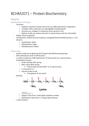 Very detailed and well-organised notes for BCHM2071. Covers all topics extensively. Topics covered: - Proteins, peptide sequencing, synthesis, structure, purification - Enzymes and kinetics - Globin and fibrous proteins - Lipids and membranes - Membrane proteins - Motor proteins - Proteomics - Post-translational protein modifications