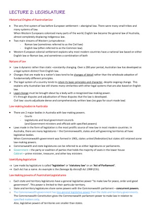 A comprehensive and easy-to-understand set of notes covering all lecture content and examinable cases. Important terms and definitions are coloured/bolded to make it easier to remember. Difficult concepts are also explained in depth. Topics: - Legislature - Case law - Contract formation - Contractual terms - Contractual breach - Remedies for Breach of contract - Circumstances that may invalidate legal transactions - Consumer Protection - Tort law - Property law and agency law These notes helped me achieve a H1 and they can definitely help you out too! Good luck!