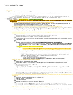 These FedCon notes combines material from lectures and readings. The structure and logic is very clear for each topic thus easy to follow. A detailed account of principles is contained in these notes, as well as key cases and statutes. Case summaries include facts, decision and principles. The key takeaways are all highlighted and colour-coded for clarity purpose. For some important cases, I have also included a one-sentence summary which is very useful in exams. The sample note is a part on the topic of external affairs power. It demonstrates the overall quality of the notes. Topics: Introduction Constitutional interpretation and characterisation Trade and Commerce Power Inconsistency External Affairs Power Defence power and Nationhood power Corporations power Race Power Grants Power and Appropriation Power Taxation Freedom of interstate trade s92 Excise duties s90 Inter-governmental immunities Compulsory Acquisition of Property Implied freedom of political communication (brief notes) Freedom of religion (brief notes)