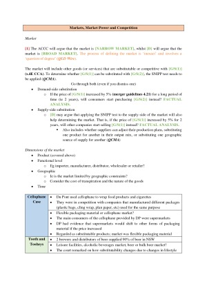 Hi, Because Competition Law is very convoluted, I've made these templates very structured and exam friendly - so you can methodically work through the issues in the exam. These templates are also colour coded so you will know which phrases are important (green), which phrases to include if time permits (orange) and which issues are interconnected (blue). The final section of the templates include 'Issue Spotting', which include red flags for most of the issues. I have also read all of the competition law cases; including comprehensive summaries in the templates. This will allow you to analogise with the cases in considerable detail. Hopefully these templates can also help you secure a HD for the unit. NOTE: My templates don't include 'Liability of Manufacturers of Goods with Safety Defects' because our assignment covered this issue. However, all of the other consumer law topics covered in sem 1, 2018, are included. CONTENTS 1. Introduction to Consumer Law 2. Product Safety Standards 3. Unfair Contract Terms 4. Unconscionability 5. Misleading or Deceptive Conduct 6. Consumer Guarantees 7. Application of the Competition and Consumer Act 8. Markets, Market Power and Competition 9. Mergers 10. Misuse of Market Power 11. Anti-Competitive Agreements 12. Exclusive Dealing 13. Resale Price Maintenance 14. Issue Spotting