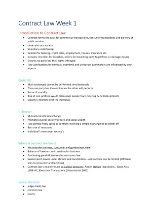 Introduction to Contract Law Formation: Agreement, Termination, Acceptance, Consideration, Intention to Create Legal Relations, Capacity, Formalities Terms of a contract: express, implied Exclusion Clauses Avoidance: Mistake, Abuse of dominant position, Duress, Undue Influence, Unconscionable Conduct, Unfair Terms, Illegality, Termination: Discharge by performance, Agreement, Breach, Frustration Remedies: Damages, Specific Performance, Injunction