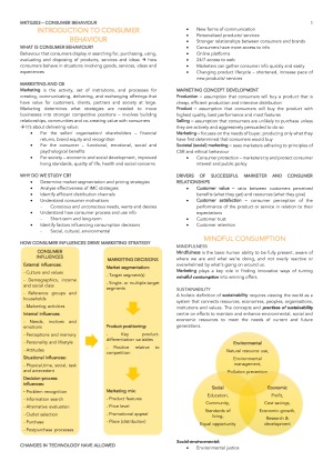 Extensive (and pretty) MKTG203 notes made with lecture and tutorial notes and information from previous Marketing subjects. Topics covered: 1. Introduction to Consumer Behaviour 2. Mindful Consumption 3. Needs and Motivations 4. Personality and Self-Concept 5. Perception 6. Learning and Involvement 7. Attitudes 8. Ethics 9. Reference Groups 10. Social Class 11. Social Change and Diffusion of Innovations 12. Culture 13. Decision-Making