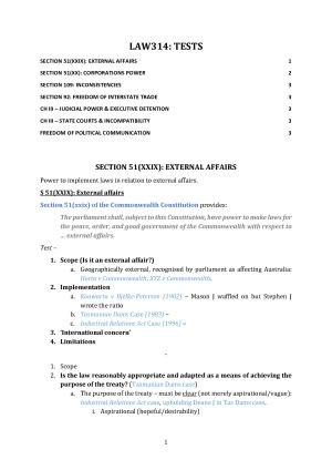 These notes are organised, colour-coded, and easy to understand. They are super helpful for the final exam as they go through the tests required for the following topics: - External affairs, - Corporations power, - Inconsistencies, - Freedom of interstate trade, - Judicial power and executive detention, - State courts and incompatibility, - Freedom of political communication.