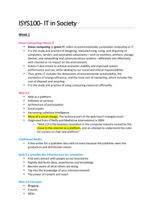 - Selling my detailed and comprehensive notes for ISYS100 in which I achieved a distinction. Topics covered: Week 1- Introduction to information technology and society – Web vs Web Week 2- Social networks- are they really that much of a game changer? Week 3- Blogs, internet journalism, the internet and democracy Week 4 – The weird, the wired and the wireless- how the internet is accessed Week 5- Graphics, digital and multimedia Week 6- Hackers, spam and phishing Week 7- The digital divide Week 8- Googlemania Week 9- How do I know which electronic device to buy? Week 10- Green IT Week 11- Evolving internet, evolving software Week 12- Robotics and artificial intelligence - Includes a variety of diagrams, mind maps and tables which help you to understand the content better! - Headings are colour coded to break down information and topics. - I spent many hours creating these notes so all the hard work has been done for you!