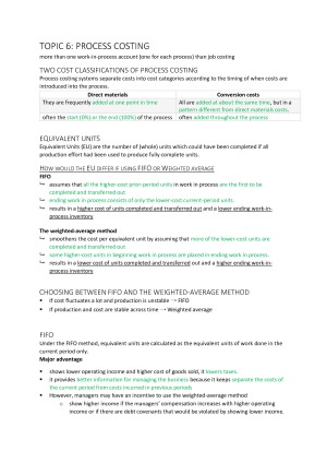 Summary notes covering all topics in the final exam TOPIC 6: PROCESS COSTING TOPIC 7 - ACCOUNTING FOR SPOILAGE, REWORK AND SCRAP TOPIC 8 - JOINT PRODUCTS AND BY-PRODUCTS (COST ALLOCATION) TOPIC 9 - PLANNING AND CONTROL 1: MASTER BUDGET AND RESPONSIBILITY ACCOUNTING TOPIC 10: FLEXIBLE BUDGETS, VARIANCES AND MANAGEMENT CONTROL - DIRECT INPUT VARIANCES TOPIC 11 - FLEXIBLE BUDGETS, VARIANCES AND MANAGEMENT CONTROL - OVERHEAD VARIANCES