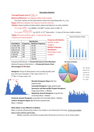 Full comprehensive notes, covering all lectures and tutorials, which will prepare you for the final exam! - Easy to understand - Set with examples - Covers all topics Topics Include: 1. Descriptive Statistics 2. Percentiles, Variability and Correlation 3. Probability Calculations 4. Joint Probability Distributions 5. Conditional Expectations 6. Continuous Random Variables and the Normal Distribution 7. The t and Pareto distributions 8. Statistical Inferences 9. Sample distributions and Unbiased Estimation 10. Unbiasedness and Central Limit Theorem 11. Hypothesis Testing 12. Hypothesis testing for a mean 13. Hypothesis testing Errors 14. Confidence Intervals 15. Comparing two means 16. From Means to Linear Regression 17. Progressing with Regressing 18. Statistical Inference with Regression 19. Regression