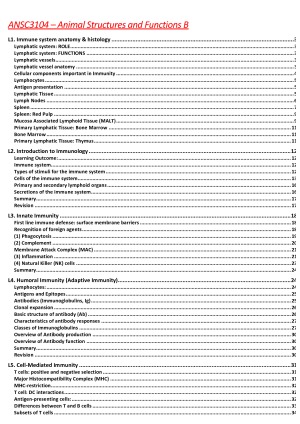 ANSC3104 Animal Structure and Function B note ONLY covers 'IMMUNITY' (out of the 3 topics). Notes including materials from lectures, practical classes handouts given by lecturers, with diagrams. Notes are written based on "LEARNING OUTCOMES" (only covering 'IMMUNITY'!) Hope this can help you in achieving the mark you want, good luck :)