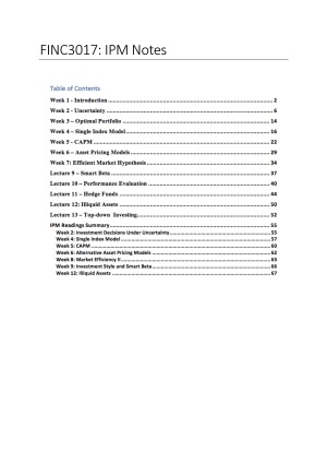 All lecture weeks with additional readings summary included. Content: Week 1 - Introduction Week 2 - Uncertainty Week 3 – Optimal Portfolio Week 4 – Single Index Model Week 5 - CAPM Week 6 – Asset Pricing Models Week 7: Efficient Market Hypothesis Lecture 9 – Smart Beta Lecture 10 – Performance Evaluation Lecture 11 – Hedge Funds Lecture 12: Illiquid Assets Lecture 13 – Top-down Investing IPM Readings Summary Week 2: Investment Decisions Under Uncertainty Week 4: Single Index Model Week 5: CAPM Week 6: Alternative Asset Pricing Models Week 8: Market Efficiency II Week 9: Investment Style and Smart Beta Week 12: Illiquid Assets