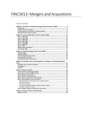 Comprehensives notes that include all weeks. I received 85 in the course and final exam using these notes. Contents: Module 1: Introduction, Acquisition Strategy and the Economics of M&A Module 2: Drivers of M&A Waves and Cross-Border M&As Module 3: Corporate Strategy and the Uses of M&A Module 4: Acquisition Search, Deal Origination, Due Diligence and Valuing Standalone Firms Module 5: Merger Valuation Module 6: Takeover Process and Deal Design Module 7: Leveraged Buyouts (LBO)