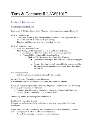 Received an 83 for the course and an HD in the final exam using these. Comprehensively includes all lectures as well as notes from the prescribed textbook. List: Lecture 1: Introduction Lecture 2: Causation and Remoteness in Contract Lecture 3: Measure of Damages in Contract Lecture 4: The Action for Debt and Penalties Lecture 5: Vitiating Factors: undue influence and unconscionable conduct; unfair contract terms Lecture 6: Vitiating Factors Under Statute Lecture 7: Duress and Mistake Lecture 8: Misrepresentation + Introduction to ACL s 18 Lecture 9: ACL s 18 Continued + Review of Vitiating Lecture 10: Tortious Interference with Goods; Lecture 11: Economic Torts 64 Lecture 12: Liability for Negligently inflicted Pure Economic Loss – Negligent misstatement and professional work Lecture 13: PEL: damage to third party property Lecture 14: Vicarious, Solidary/Concurrent/Joint & Several Liability and Contribution rights Lecture 15: Outline and Study Guide to Proportionate Liability