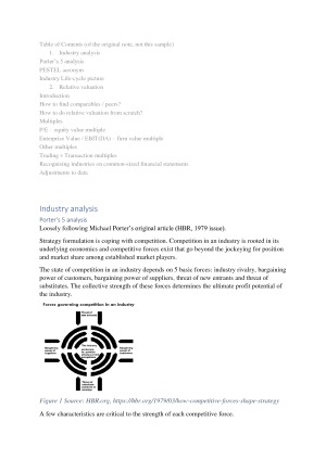 Handy short summary covering every concept you need to know for the first quiz. Also, industry-specific characteristics listed to solve common-sized balance sheet questions. Contents Industry analysis 1 Porter’s 5 analysis 1 PESTEL acronym 4 Industry Life-cycle picture 4 Relative valuation 5 Introduction 5 How to find comparables / peers? 5 How to do relative valuation from scratch? 5 Multiples 6 P/E – equity value multiple 6 Enterprise Value / EBIT(DA) – firm value multiple 6 Other multiples 6 Trading v Transaction multiples 7 Recognising industries on common-sized financial statements 7 Adjustments to data 8