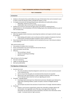 - Introduction and Nature of Court proceedings - Verbal Evidence and Witness Examinations - Documents and other evidence - Relevance - Hearsay Evidence - Admissions - Opinion Evidence - Tendency and Coincidence Evidence - Credibility and Character Evidence - Priviliges - Mandatory and Discretionary Exclusions - Notes include TB, lecture slides