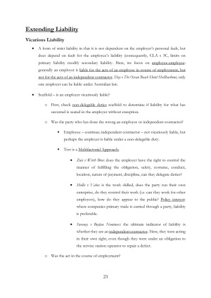 These notes include scaffolds, summaries and are designed to help you prepare your unit outline for the closed-book LAWS1017 exam. They cover: Vitiating Factors in Contract: Rescission and Limitations Undue Influence Unconscionable Conduct; Unjust Contracts; Unfair Contract Terms Mistake; Non Est Factum Misrepresentation at Common Law Misleading conduct under Statute Torts: Tortious Interference with Goods Intentional Economic Torts Pure Economic Loss – general concerns Pure Economic Loss from Negligent Misstatements Pure Economic Loss from Professional Negligence to Contractual Parties and Third Parties Pure Economic Loss from Damage to Third Party Property Pure Economic Loss from Injury to Third Parties Pure Economic Loss from Defective Structures and Products Extending Liability: Vicarious Liability Non-Delegable Duties Multiple wrongdoers: Joint and Several Liability and Proportionate Liability They do not contain detailed case summaries.