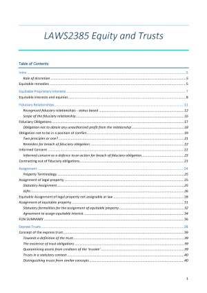 I used these notes to achieve a distinction (82) in Equity and Trusts and a HD in the mid-semester assignment (88). The notes contain detailed explanation of all content and excellent case summaries - perfect for CP. In addition, I have included a fully summarised scaffold perfect for answering the exam/mid-sem problem question. This includes ALL necessary cases and legislation. Colour coding and diagrams are used throughout to help with your understanding of the course content. Topics included: - Creation of trust - Formalities of trust - Certainties for trust to exist - Trustee powers and duties - Defences to breaches - Indemnification - Assignment - Fiduciaries - Express Trusts - Remedies - Following / tracing - Priorities - Remedies - Resulting trusts - Constructive trusts - Bars to relief