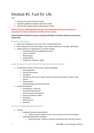 Complete Study notes for BIOL1008 Human Biology (BIOL1003 before 2018) Covers all four key modules: - Fuel for Life - Aerobic Health - Daily Defence - Human Diversity Lots of pictures accompanying text for ease of reading.