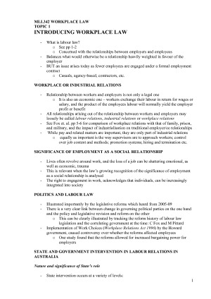 By using these MLL342 notes, I achieved a score of 72 in the exam! These concise, thorough and complete notes for MLL342 include complete summary of: prescribed textbook; case summaries; relevant legislation. Covering all topics in the unit, these materials could essentially be used as a replacement to the prescribed textbook, while being more concise, easy to read, and less time consuming. These MLL342 notes will be a fantastic supplement to your studies, and a vital resource come exam time. These are a complete summary of the MLL342 lectures, textbook, cases, legislation and topic guides. A COMPLETE SET OF MLL342 NOTES. TOPICS COVERED: TOPIC 1: INTRODUCING WORKPLACE LAW TOPIC 2: DEFINING THE EMPLOYMENT RELATIONSHIP TOPIC 3: RIGHTS AND RESPONSIBILITIES IN AN EMPLOYMENT CONTRACT TOPIC 4: EMPLOYMENT REGULATION UNDER FW ACT: OVERVIEW TOPIC 5: STATUTORY EMPLOYMENT STANDARDS TOPIC 6: FREEDOM OF ASSOCIATION AND INDUSTRIAL ACTION TOPIC 7: DISCRIMINATION AND SEXUAL HARASSMENT TOPIC 8: WORKPLACE HEALTH AND SAFETY TOPIC 9: TERMINATION OF EMPLOYMENT