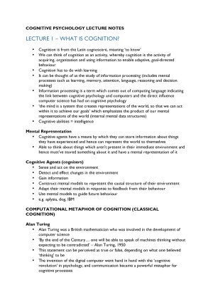 These notes comprehensively cover all topics in the cognitive psychology course. They include detail from lectures (including examples and studies), required readings and topics covered in tutorials. They're perfect for studying for the end of year exam. Topics covered include: - cognition - memory - learning and reasoning - attention - language - emotion