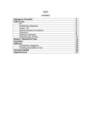 These notes are comprehensive exam notes, covering weeks 1-12 content. They are divided up by topic, and are ready to be used to answer exam questions. The topics covered include: - A negligence checklist - The Duty of Care (including reasonable foreseeability, established categories of duty, scope and salient features, special situations/exceptions, omissions, particular defendants, and particular types of harm) - Breach and standard of care - Causation Defences (including contributory negligence and voluntary assumption of risk) - Vicarious liability - Apportionment