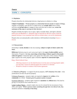 Notes cover all topics throughout the course with comprehensive and succinct cases from the reading guide. I received an 86 for Property and I hope these notes will help you excel. Covers Topics: 1. Concepts 2. Fragmentation of Property 3. Land Title 4. Legal and Equitable Interests 5. The doctrine of Tenure and Estates 6. Possession and Adverse Possession 7. Acquisition and Transfer of Property Interests 7A. Gifts of Real/Personal Property 8. Leasehold Estates 9. Creation of Leases 10. Contractual Licences 11. Easements 12. Restrictive Covenants 13. Mortgages
