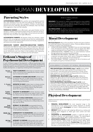 A continuation of a series of thoughtfully designed study notes for the visual learners, designed by a graphic designer. Combines detailed chapter summaries, module content and definitions into one/two pagers for easier studying. Topics covered: Research in Psychology Learning Memory Cognition Language Intelligence Motivation Human Development Social Cognition Social Influence Cross-Cultural Psychology I have also included a link at the end to the Quizlet created to help myself remember terms/concepts from these notes. Hope it helps :-)