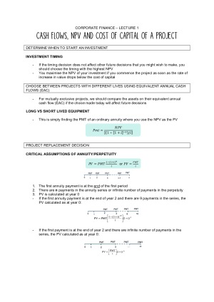 Extensive textbook & lecture notes! Helped me get a HD. Notes are edited and formatted, and can be printed as it is. LIST OF TOPICS: L1 : CASH FLOWS, NPV AND COST OF CAPITAL OF A PROJECT L2 : EVALUATING AND MITIGATING THE RISKS OF A PROJECT: REAL OPTIONS L3 : COMPETITION AND PROFITABILITY L4 : MANAGEMENT COMPENSATION AND PERFORMANCE MANAGEMENT L5 : INTRODUCTION TO SUSTAINABLE INVESTMENT L6 : ETHICS AND FINANCE L7 : PAYOUT POLICY AND VALUATION L8 : DOES DEBT POLICY MATTER? L9 : OPTIMAL FINANCING POLICY L10 : ESTIMATING THE FIRM’S COST OF CAPITAL, WACC