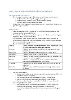 Full detailed notes Topics including: The global manager's environment The role of culture in global management Cultural Values and comparative management Communicating across culture Leading in Global Organisation Negotiating Across Cultures Ethics and Corporate Social Responsibility Managing work and motivation across cultures Developing global teams Managing in emerging markets and the developing world Managing Human Resources in Global Organisations