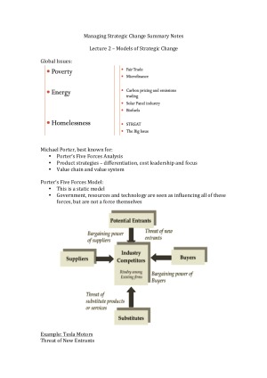 These MGMT30005 (Managing Strategic Change) notes contain detailed and comprehensive examples and explanations for all content from lectures 2-10. All information for any questions covered in the exam can be found in these notes. Notes contain information from all lectures, including the following topics: - Models of strategic change - Driver of innovation - Competition - Competitive status - Legitimacy - Institutional change (homogeneity, logic, etc.) - Structure strategy - Deliberate vs emergent change - Managing change and resistance