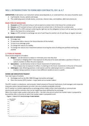 Very extensive notes covering all lectures, tutes examples and notes from the book, includes everything you need to know! With these notes I achieved a final mark of 94. Content: 1. Introduction to forward contracts 2. Futures contracts 3. Hedging with futures 4. Pricing forwards and futures 5. Interest rate futures 6. Swaps 7. Mechanics of options 8. Properties of stock options 9. Option trading strategies 10. Option valuation