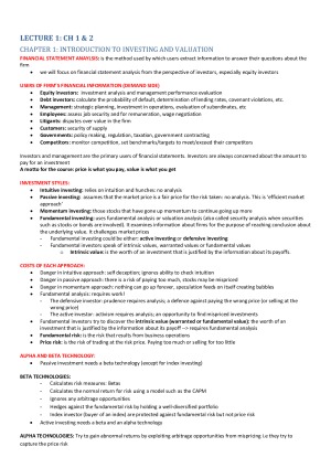 Using these notes I achieved a mark of 86. Very extensive finance notes, going through all course concepts and formulas required. Notes gathered from lecture notes, textbook, past exam questions and tute questions and only relevant topics are included. Everything you need to know to get high marks! Content: 1. Introduction to investing and valuation 2. Introduction to financial statements 3. How financial statements are used in valuation 4. Cash accounting, accrual accounting and DCF valuation 5. Accrual accounting and valuation 6. Valuation and active investing 7. Viewing the business through the financial statements 8. Analysis of the statement of shareholder's equity 9. Analysis of the balance sheet and income statement 10. Analysis of the statement of cash flows 11. Analysis of the quality of financial statements 12. Analysis of profitability 13. Analysis of growth and earnings 14. Forecasting and valuations 16. Natural resource valuation 17. Multinational firms and operations