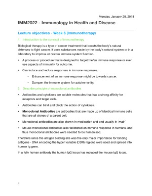 The following information contains lecture objectives, notes and material for exam and tests used. There are two parts to these notes and this is PART 2. It contains info from week 6 - 11. Week 6 - Immunotherapy Week 7 - Infection and Immunity Week 8 - Transplantation Week 9 - Sex, attraction and pregnancy Week 10 - Mental health and the immune system Week 11 - Inflammation
