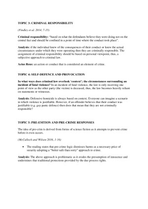 Comprehensive general notes and definitions plus a week by week rundown of the tutorial questions that include an analysis of the readings. These notes cover: - Due process rights - Approaches to crime - Periods of criminal law - Critiques of criminal law - Ethical theories of crime - Criminal responsibility - Homicide Defences - Pre-crime responses - Cross-cultural perspectives - White collar crime - Plea-bargaining