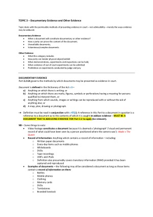 Very useful Evidence Law notes - comprehensive outline of all topics - comprised from the Evidence Act, case law, topic summaries, lectures and the textbook. These notes contain a very detailed step-by-step guide to all topics at the beginning. This allows for issue spotting and easy/structured answers in exam style format. Topics Include - Introduction Verbal Evidence Documentary and Other Evidence Relevance Hearsay Admissions Opinion Tendency and Coincidence Credibility and Character Privileges Discretions to Exclude