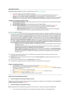 These notes are comprised of materials derived from the textbook, lectures/slides, study guide, tutorial questions and exam questions/answer guides. Each overall topic contains an easy to follow road-map at the beginning to aid in pinpointing issues in an exam style situation, allowing structured and simple to follow answers. Topics Include - Introduction: General Law Land and Priority Rules Torrens System: - Indefeasibility - Statutory Exceptions to Indefeasibility: Fraud, Erroneous Description and Prior Certificate of Title - Non-Statutory Exceptions to Indefeasibility: Inconsistent Legislation, In Personam Exception, Volunteers, - Registrar's Power to Correct Errors - State Guarantee of Title Unregistered Interests: - Unregistered Interests and Priority Rules - Caveat System Co-Ownership - Types & Creation of Co-Ownership - Duties of Co-Owners - Severance of Co-Ownership