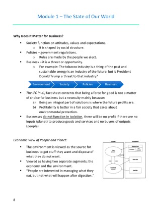 Notes include each module that was taught in the unit. Notes are made up of lecture and tutorial notes. Includes table of contents of important topics and theories presented. Received a distinction in this unit thanks to these notes. Topics include: - Module 1 - The State of Our World. - Module 2 - Sustainable Development and Weak vs. Strong Sustainability. - Module 3 - Corporate Social Responsibility. - Module 4 - The Natural Step and Natural Capitalism. - Module 5 - Cleaner production, Eco-efficienct and eco-effectiveness. - Module 6 - Environment Management Systems and ISO Certification. - Module 7 - Social and Eco-Entrepreneurship. - Module 8 - Green and Sustainability Marketing. - Module 9 - Sustainability Reporting. - Module 10 - Stakeholders: Government and NGOs. - Module 11 - Stakeholders: Ethical Investors and Sustainable Consumers.