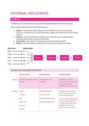 This is a summary of the CB course and includes notes from Weeks 1-12. This does NOT include notes from every single slide but rather what the KEY concepts, definitions and processes discussed in lectures are. Includes: -Situational influences -Problem Recognition -information search -evaluation and selection -store choice and purchase -post purchase process -perception -learning -memory -motivation -personality -self-concept -attitude -culture -groups and social stratification -household and age -B2B Marketing