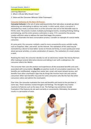 • Chapter 1 - What is CBE and why should I care? Week 1 • Chapter 2 - The consumer behaviour value framework Week 1 • Chapter 3 - Consumer learning starts here: Perception week 2 • Chapter 4 - Comprehension, Memory, and Cognitive Learning week 3 • Chapter 6 - Personality, Lifestyles, and The Self-Concept week 4 • Chapter 7 - Attitude and Attitude Change week 5 • Chapter 8 - Group and Interpersonal Influence week 5 • Chapter 9 - Consumer Culture week 7 • Chapter 12 - Decision making 1: Need Recognition And Search week 8 • Chapter 13 - Decision making 2: Alternative evaluation and choice week 9 • Chapter 14 - Consumption to Satisfaction