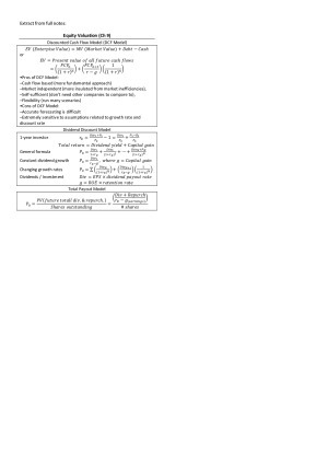 These 2 pages of notes include a few formulas and concepts from the first half of the semester, but focus on weeks 7 to 12 material, like the final exam does. topics: Capital budgeting, Equity valuation (DCF model, Dividend Discount model, etc), Risk & return, and Portfolio theory