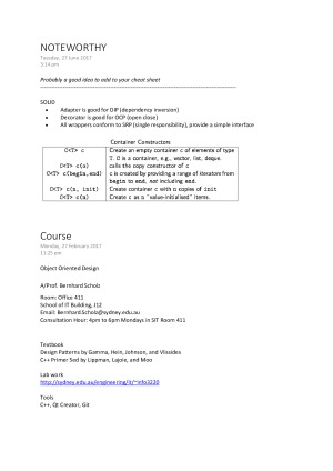 These INFO3220 notes include my raw personal lecture notes, laboratory examples, and textbook summaries. It includes examination and assignment hints. I received a final mark of 90 (High Distinction). TOPIC LIST * Introduction to C++ * Constructors * Multiple inheritance * Operator overloading * C++ standard library (STL) * Associative containers * Smart pointers * What are design patterns? * Design pattern usage * UML conventions * SOLID design principles * RAII design + Examination hints