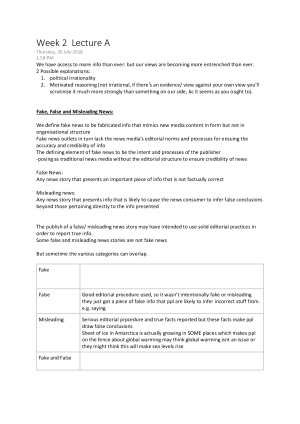 Week 2a and 2b Lecture Notes, diagrams, interpretations, synthesis. Topics Include: - Fake, False and Misleading News: - Eco chambers and epistemic bubbles: - conflicts of interest