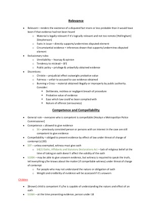 These notes summarises all examinable lectures slides and relevant textbook chapters. The notes are set out logically such that you are able to tackle a problem question with ease, clearly outlining the steps required and the case authorities for the propositions (all colour coded!) They are designed so that it is easy to follow under time pressure in an exam setting. Topics include: - Relevance - Competence and compellability of witnesses - Accused as a witness - Corroboration - Propensity and Similar Fact Evidence - Privileges - Opinion Evidence - Hearsay - Confessions and Admissions (as an exception to hearsay) - Course of Trial