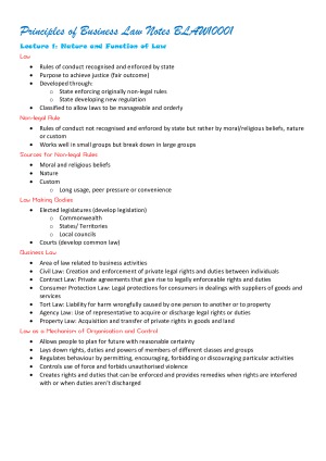 Detailed but concise set of notes that can help you achieve your H1! Topics: - Nature and Function of Law - Legislation as Source of Law - Case Law - Contract Formation: Legally Binding Contracts - Contractual Performance, Breach and Discharge - Remedies for Breach of Contract - Vitiating Factors - Australian Consumer Law - Tort Law - Agency Law Included in the notes are the cases, additional readings, e-tutes and lectures just in case you miss anything! Don't bother with property law as it isn't examined. There is also a cheat-sheet available available for purchase separately if you don't want to make one yourself (it's time consuming). GL with that elusive H1!