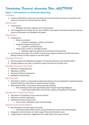 Detailed but concise set of notes that can help you achieve your H1! Topics: - Introduction to Financial Reporting - Double Entry - Accrual Accounting - Inventory - Bank Reconciliation, Revenue Recognition and Receivables - Non-Current Assets - Liabilities - Equity - Statement of Cash Flows - Annual Reports - Goods and Services Tax Included in the notes are additional readings, tutes and lectures in case you missed anything! GL with that elusive H1!