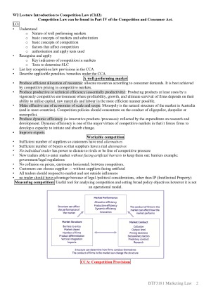 This notes includes topics from weeks 1 to 4: Wk 1 introduction (Ch1) Wk 2 Intro to competition law (Ch12) Wk 3 Competition law Wk 4 Online commerce (Ch19) The textbook we used is the "Marketing and the Law" 5th edition. Within each weeks I incorporated my textbook reading notes, tutorial scenario question notes, also steps in answering the questions. I use this notes as a guidance throughout my preparation for (1) mid-sem test and (2) online quiz since we are only allowed to bring authorised physical textbook (with no paper attached) into the mid-sem test venue. Hope you find this notes useful as I did.